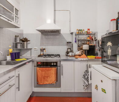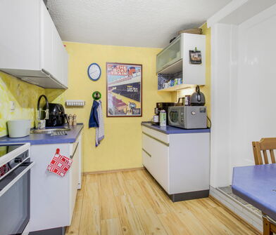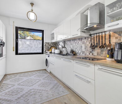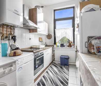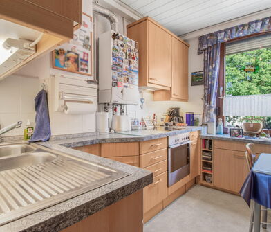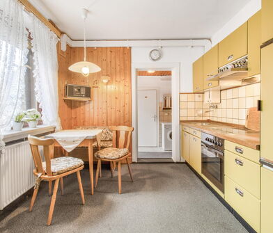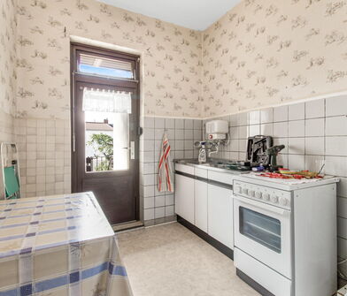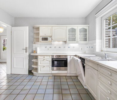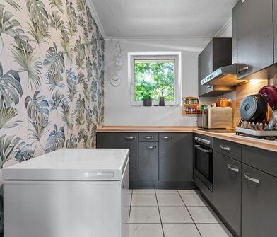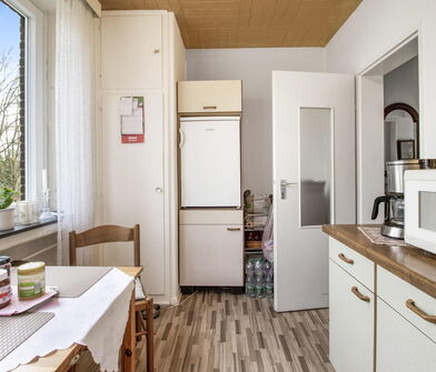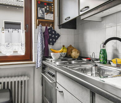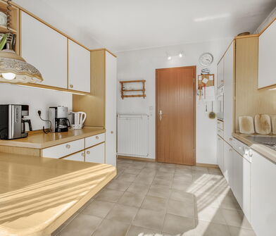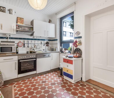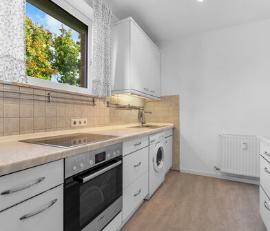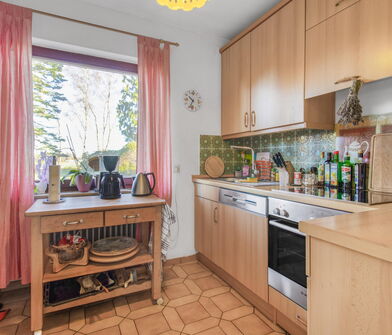 In der Küche sind die Wände im Bereich der Arbeitsfläche mit Fliesen verkleidet.