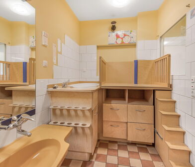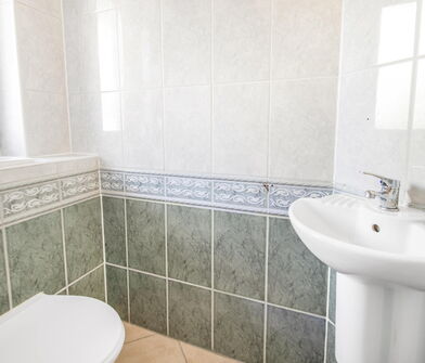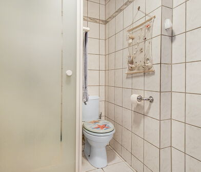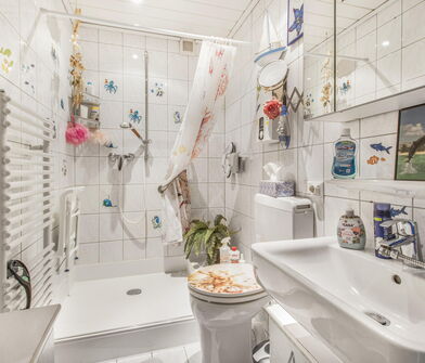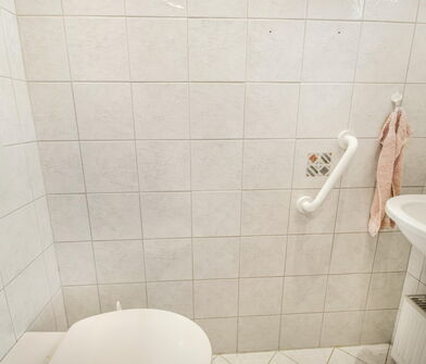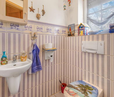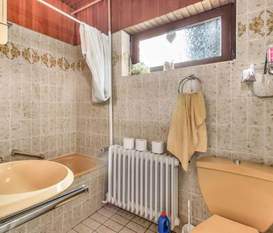 Im Badezimmer sind die Wände bis zu 1,50m ebenfalls mit Fliesen verkleidet.