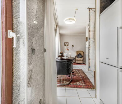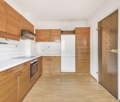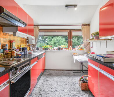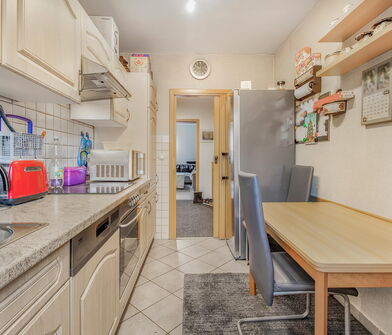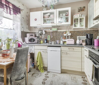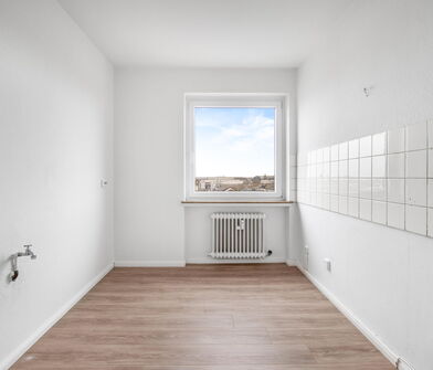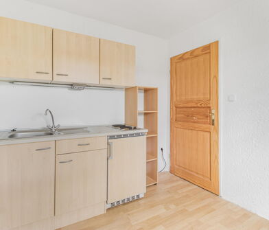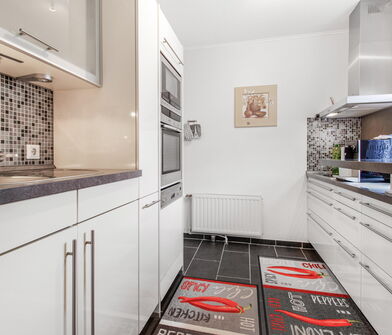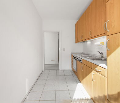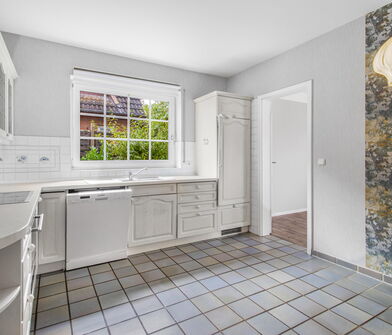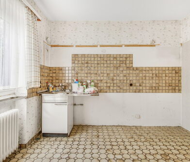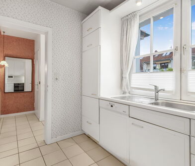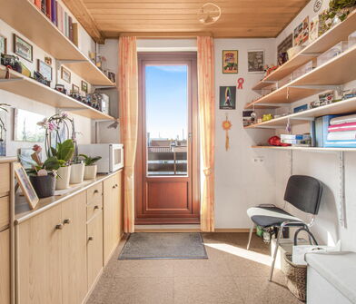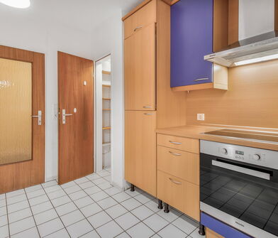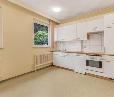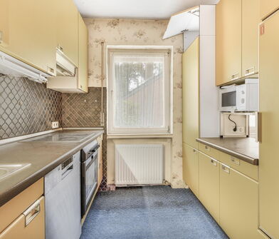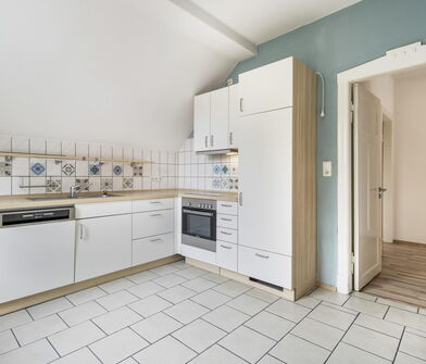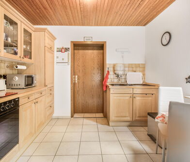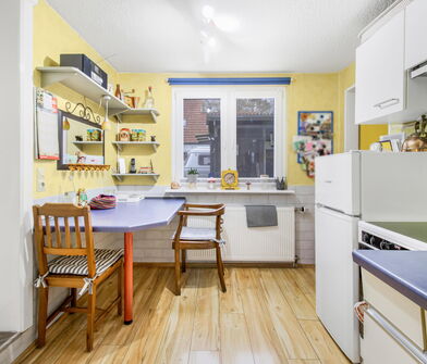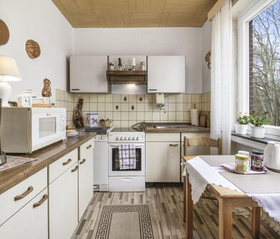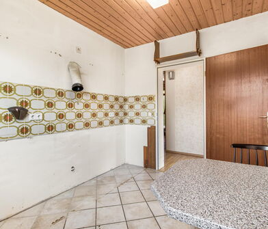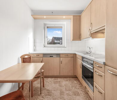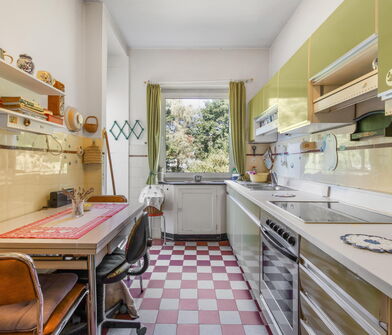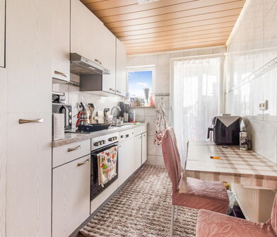 Die Küche ist mit Linoleum belegt.