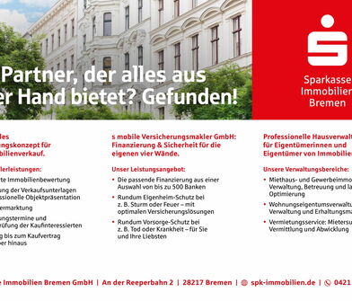 Herrschaftliche Jugendstilvillen, Altbremer Häuser und der Bürgerpark prägen das gehobene Schwachhausen. Ob Bummeln in der Wachmannstraße, Bootstouren am Emmasee oder die Geschichte Bremens im historischen Focke Museum entdecken, dieser Stadtteil beherbergt diverse Freizeitangebote und Erholungsmöglichkeiten. Doch auch die Infrastruktur spricht für Ihren neuen "Place to be". Denn neben Einkaufsmöglichkeiten, Cafés/ Restaurants, Schulen und Kindergärten, gewährt Ihnen das ausgeprägte Verkehrsnetz eine vorteilhafte Anbindung.