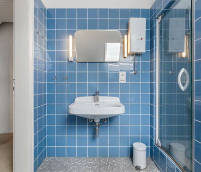 Das Badezimmer ist gefliest.