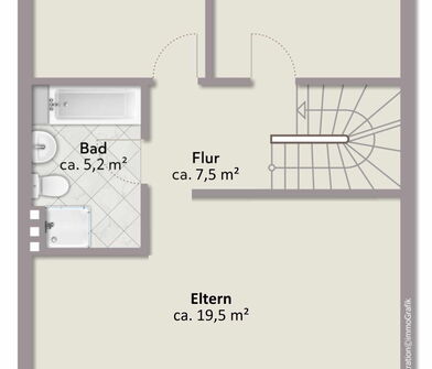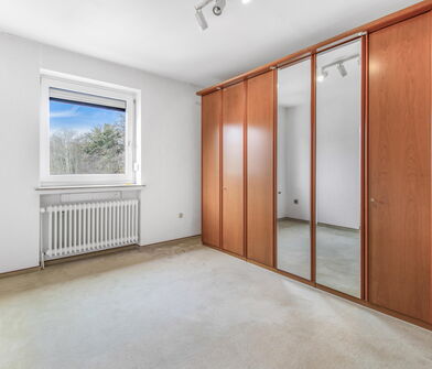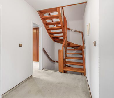 Über die Treppe gelangt man in das Obergeschoss, wo sich drei Schlafzimmer sowie ein Badezimmer befinden. Das großzügige Elternschlafzimmer bietet ausreichend Platz für ein großes Bett und zusätzliche Möbel, während die beiden weiteren Zimmer ideal als Kinder-, Gäste- oder Arbeitszimmer genutzt werden können.